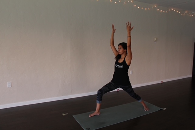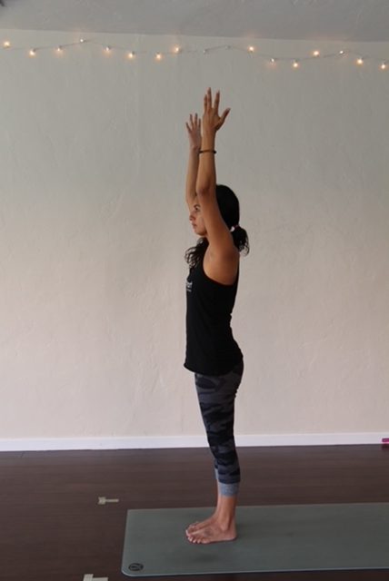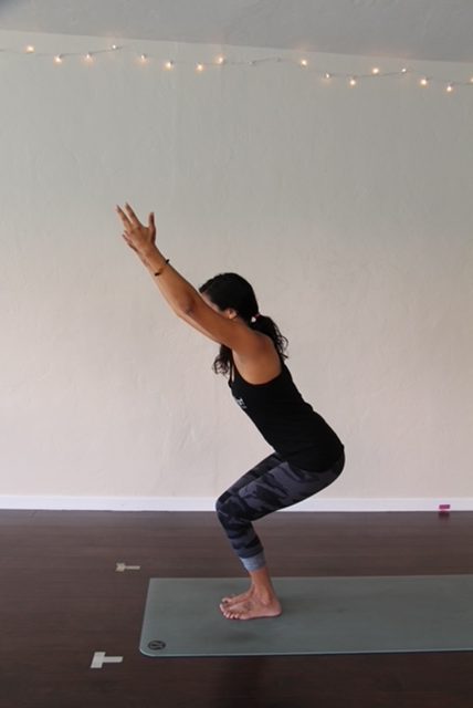 As you move into chair pose, take a deep inhale. The purpose of this pose is to help build heat in your body. It also helps strengthen your legs. The alignment of this pose can really vary body to body type. Some students have no problem keeping their chest lifted. Others will bend more from the hips and have their chest more parallel to the mat. This happens for a few reasons: ankle and hip mobility, hamstring and calf flexibility, or ability to activate the core muscles. It is okay to create the pose for how it fits your body, butthe general idea is to keep your core and leg muscles engaged to create the sweat we love in this practice.