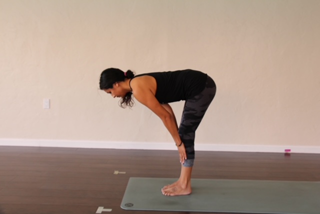 Check back to our blog post about Integration to learn more about the alignment for a Forward Fold. As you move from Extended Mountain Pose to Forward Fold you will exhale your breath.